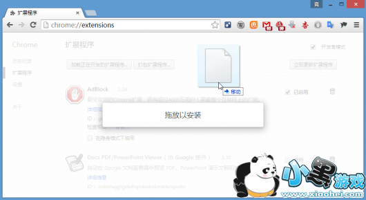 3、选中解压后的“Tampermonkey.crx”文件,按住鼠标左键将文件拖拽至Chrome浏览器的主界面中,看到Chrome浏览器中出现“拖放以安装”提示时,松开鼠标左键。(360浏览器之类,直接双击即可安装)