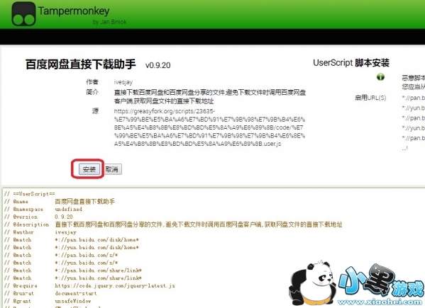 7、打开网址https://greasyfork.org/zh-CN/scripts/23635-百度网盘直接下载助手 ,点击安装此脚本,等待弹出对话框后点击安装即可把下载助手安装完成。