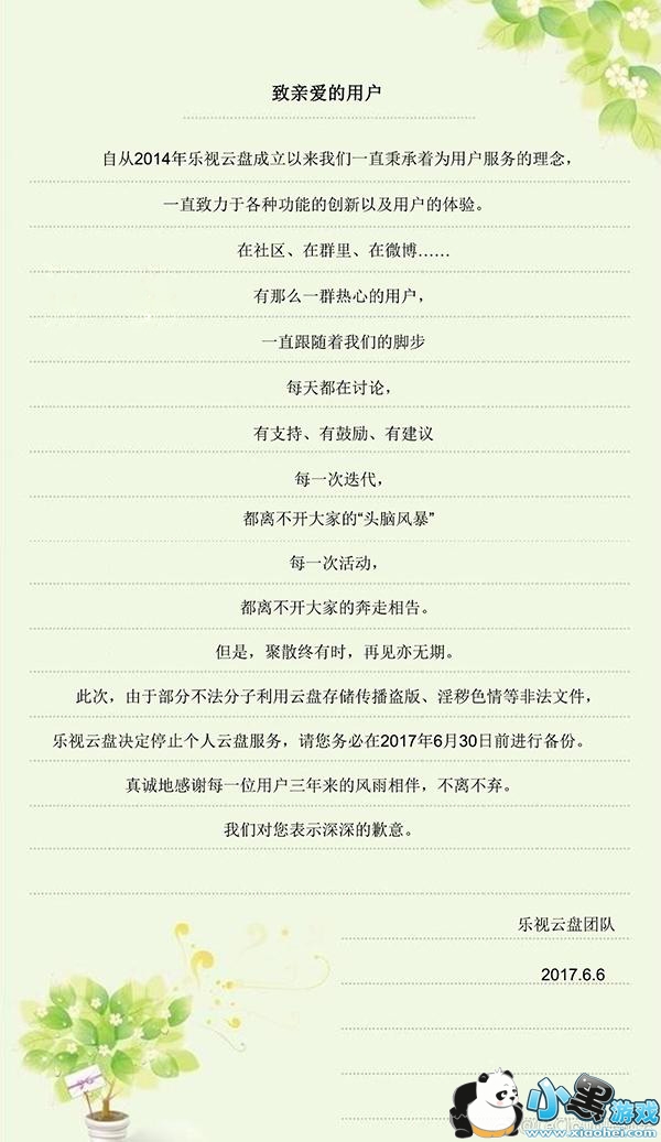 现在,乐视云盘也发布了停服公告,宣布将停止个人云盘服务,具体时间为2017年6月30日。