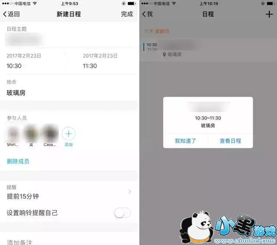 日程功能在移动端的「我」页面即可找到,你除了能记录下当天的日程定时提醒外,还能直接向好友约会议时间,让工作更有条理。