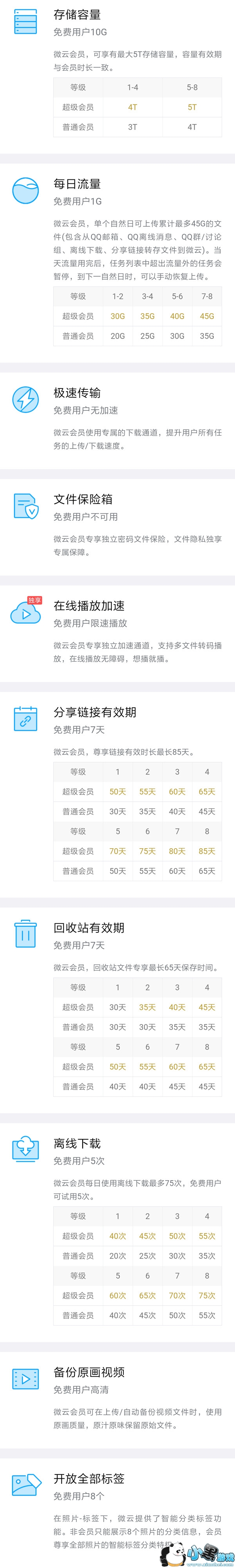 与微云普通会员相比,微云超级会员拥有额外1TB的云存储容量,5~8级VIP将达到5TB的容量,每日的流量也比普通会员最高多出10GB,除此之外在回收站有效期、分享链接有效期上也远超普通会员。