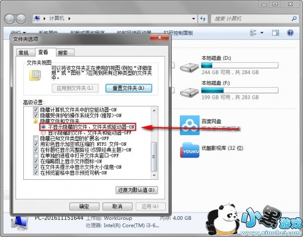 3.进入文件夹选项,点击【查看】,选择【不显示隐藏的文件、文件夹或驱动器】,这样一些系统文件不需要的文件将会自动隐藏!