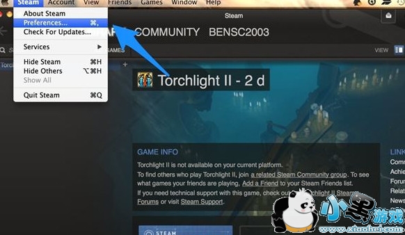 在 Steam 的菜单中选项中,点击打开 Preferences 选项,如图所示