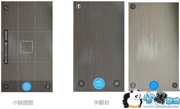 三者界面布局和信息内容都相似,都有拍照按钮、退出、相册以及闪光灯,作业帮和小猿搜题的相册使用汉字,并且拍照时有参考线,而学霸君没有参考线,相册使用图标表示,并且选取图标符合人的认知行为习惯;至于相册和退出的位置可以用人眼轨迹图进行测试,然后再选择放置位置;对于拍照聚焦方面,如果聚焦内容中没有明显的字母、数字或者字符,学霸君和作业帮都会提醒无法聚焦,提高搜题的成功率,而小猿搜题没有此类提醒。