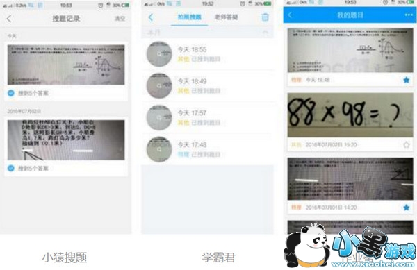 页面布局:在搜索记录中,作业帮和小猿搜题采用的界面布局相同,图片较大,可以看清部分内容,方便搜索题目,但其缺点是一瓶显示的题目个数较少,学霸君采用列表式,一屏显示的内容较多,但看不到具体内容,不便于寻找题目。