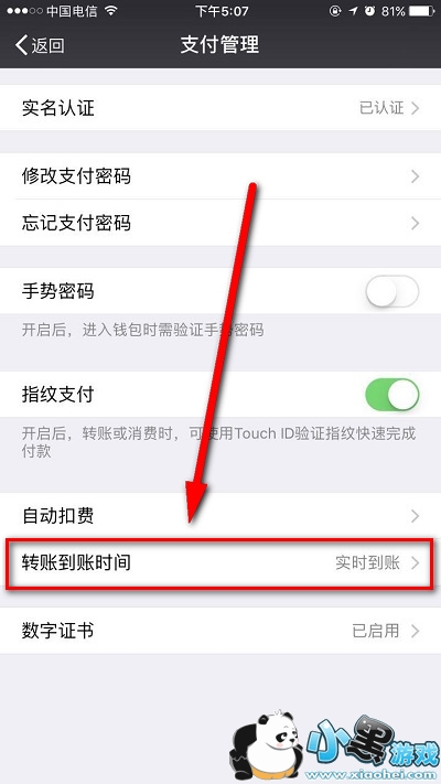 4.点击进入【转账到账时间】功能设置;