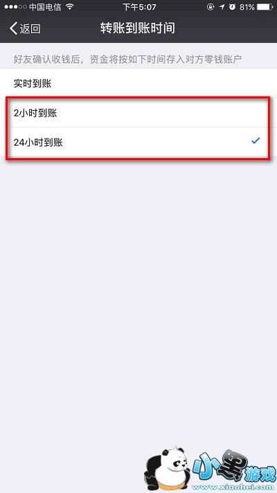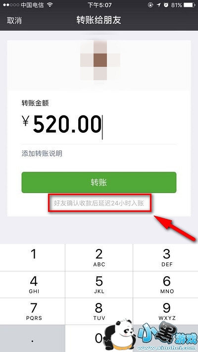 6.给任意好友转账任意金额将显示,【好友确认收款后延迟24小时/2小时入账】;