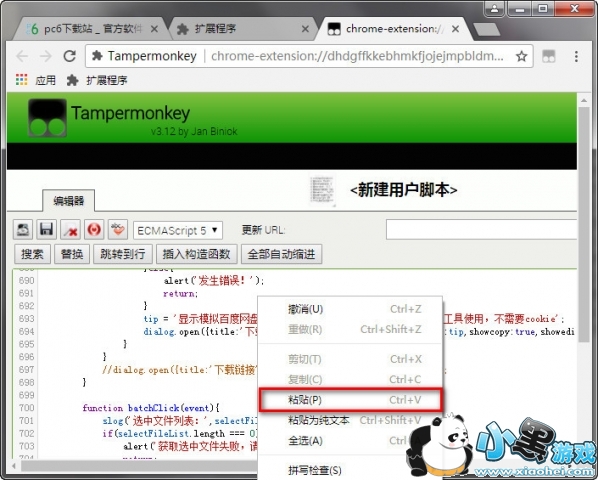 5、打开Tampermonkey插件新建脚本页面,点击右键将代码粘贴;