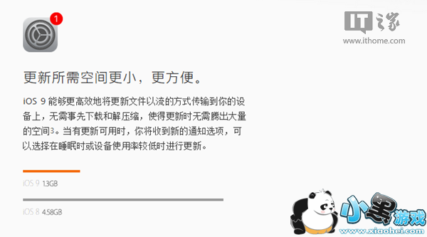 iOS9大幅精简了更新所需要的剩余空间大小,此前的iOS8正式版更新所需体积高达4.5GB左右,而iOS9更新仅需要1.3GB左右,对于16GB版本用户而言绝对是一大福音。