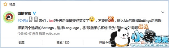 微博客服也公布了应对此问题的方法,“进入Me后选择Settings后再选择第四个选项的Settings,选择Language,将‘跟随手机系统’改为'简体中文’即可”。