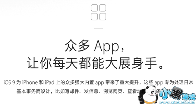 总体来看,iOS 9 在各个方面都实现了提升,让你每一天都能尽情享受。你的各种 app 将更好用,更不可或缺。iPad 上的多任务处理功能,将会助你提高效率。Siri 能为你帮上更多的忙,甚至在你开口之前,全新的主动建议功能就可以帮你把事情办妥。对整个操作系统基础的优化改进,使性能、电池续航和安全性得到进一步增强。总而言之,你用 iOS 9 的时间越久,就越会发现自己有多离不开它。