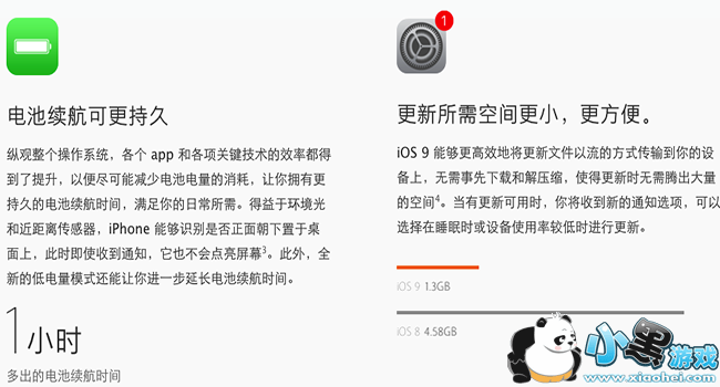 全新的省电模式,iOS 9 会让你的 iPhone 以及 iPad 更省电,电力可以比之前延长 1 个小时。此外 iOS 9 提供了省电模式,下次看到发红的电池不用那么心惊胆战了。更小的升级空间,升级 iOS 9 的时候你不用腾出 4.58 GB 的空间了,现在只需要 1.3 GB。