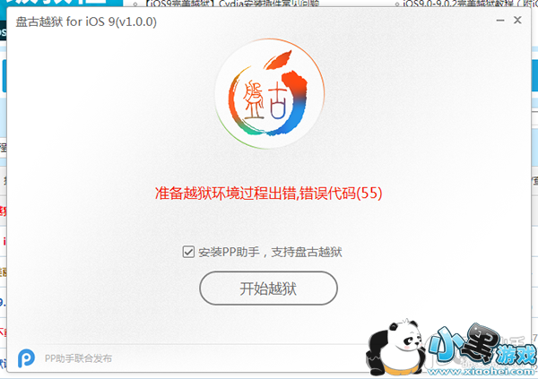 今天国内著名越狱团队盘古携手PP助手发布了iOS9.0-9.0.2正式版越狱工具,支持iPhone4s等全系列可升级iOS9的设备越狱。不过有不少iPhone用户在越狱过程中出现“准备越狱过程环境出错,错误代码(55)”的错误提示,下面PC6小编教大家iOS 9越狱过程中,错误代码(55)解决方法。