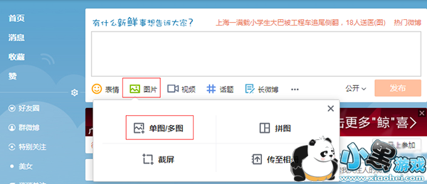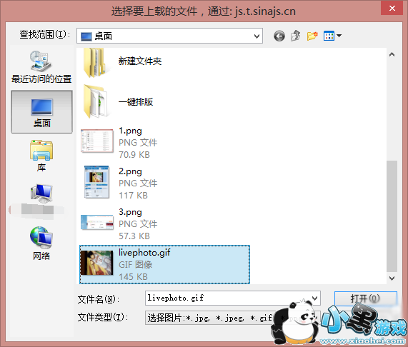 3. 基本上,到了这一步已经接近尾声了,只要将这张图片上传到微博即可。打开微博,点击图片 > 单图/多图,在弹出的窗口中选中刚刚生成的 GIF 动图,就可以发布了。