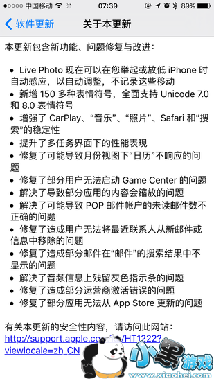 该更新目前已能通过无线方式进行升级,升级大小约为313MB。以下为苹果官方升级内容说明: