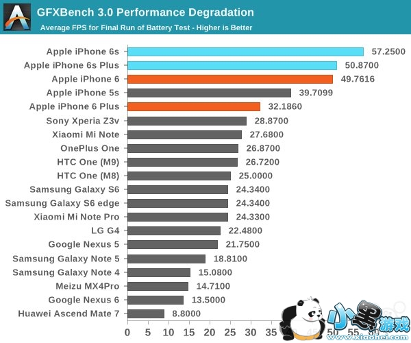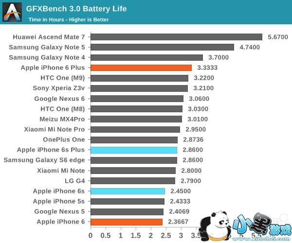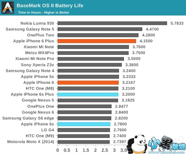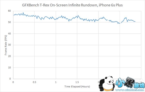 为了测试在极端使用情况下的iPhone电池续航,AnandTech使用Basemark OS II和GFXBench来给CPU和GPU“施压”,看看在这样的情况下设备的电能损耗如何。同时我们也能知道在相对持续的高负载下哪些部件会降低性能。不过要指出的是,因为某些原因Basemark OS II和GFXBench的测试结果没有Android设备的那么准确。