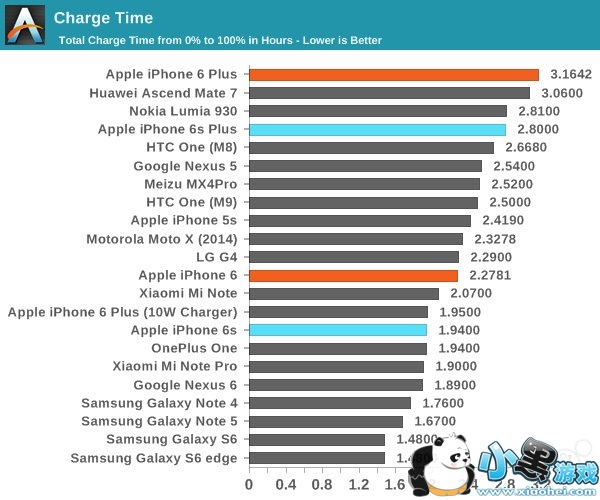 虽然电池续航是决定设备整体移动性的主要因素,但是充电时间也是一个重要的因素。一款手机如果它的充电时间过长,那么它的移动性当然不及其他充电较快的设备。iPhone 6s仍然配备5W充电器。测试是看设备从完全没电到完全充满需要多长时间。