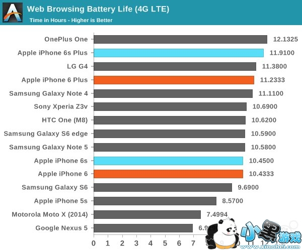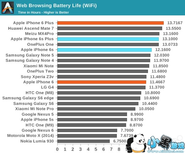 第一项测试是Wi-Fi网络浏览。iPhone6s Plus相比iPhone 6 Plus得分更低,而iPhone 6s则高于iPhone 6。你也许会好奇为什么会有这样的结果,AnandTech认为可能是iPhone 6s的SoC功耗比屏幕的更高。屏幕越大,SoC的效能就越不明显,这也就是为什么iPad Air 2不管是网络浏览测试还是空白屏测试,电池续航都没有很大的差异。测试使用的机型运行的是TSMC A9,所以这里不存在芯片差异导致差别的情况。