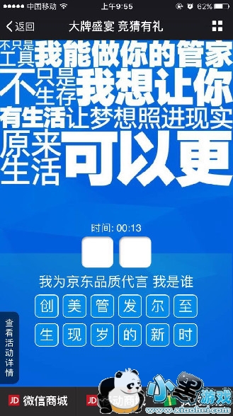 我为京东品质代言,我是谁?答案是并不一定就是“乐视”,而是一个随机品牌,答案就在题目的背景图片上。10.02京东在微信里面推出重磅优惠广告,狂送25亿元的优惠券,所有的微信网友们只需要回答京东的问题就可以拿到10到100元不等的京东优惠券。