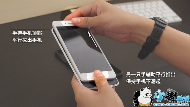 2. 一手捏住酷壳,一手捏住iPhone,慢速将两者水平抽离即可。