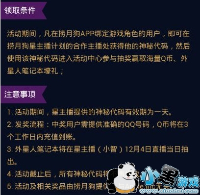 凡是在捞月狗app中绑定游戏角色的用户,即可在捞月狗星主播计划的合作主播出获得他的神秘代码,然后使用该神秘代码进入活动中心参与抽奖赢取海量Q币,外星人笔记本豪礼!acjz hyxm hysj hyxl hykr目前小编知道的只有这四个。
