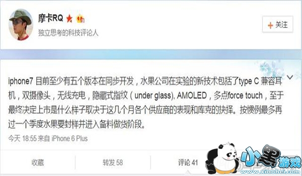 根据网友摩卡 RQ 在微博上披露的消息称,iPhone 7 目前至少有五个版本正在同步开发,苹果在测试的新技术包括了 Type-C 接口兼容耳机、双摄像头、无线充电、隐藏式指纹识别(under glass)、AMOLED 触控屏和多点 Force Touch 触控等等。