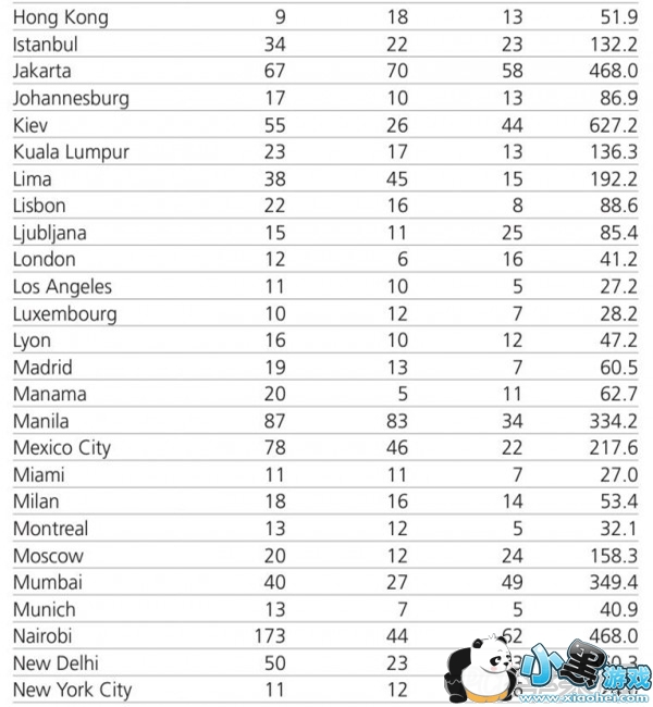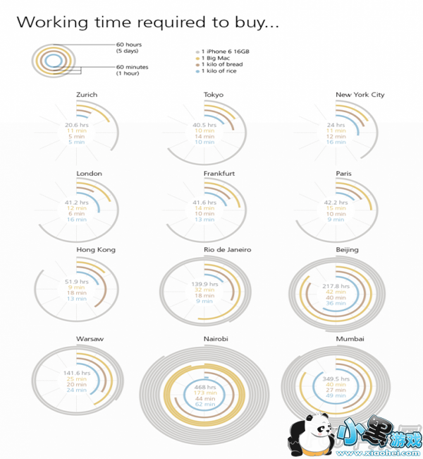 此外,印尼和肯尼亚首都雅加达和内罗毕并列第二,接下来第三名为埃及首都开罗,具体来说第二和第三名购买一台 iPhone 6 需要工作的时间分别为 468 小时和 353.4 小时。作为对比,「倒数」第一、也就是购买一台 iPhone 6 最轻松的是瑞士苏黎世,在这个欧洲最富裕的城市中只需工作 20.6 个小时就能入手一台 iPhone 6 了。「倒数」第二的依然来自瑞士—日内瓦 21.6 小时,接下来依次是 24 小时的美国纽约、27 小时的美国迈阿密和洛杉矶等。