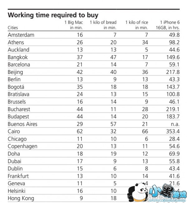 近日瑞士联合银行(以下简称「瑞银」)公布了 2015 年度全球购买力报告(Prices and Earnings 2015),以购买一台 16GB 容量的 iPhone 6 所需要花费的工作时长作为评分依据,揭露了全球 71 个城市的 iPhone6 要工作多久才能买一台。瑞银最新报告认为,iPhone 6 像麦当劳「巨无霸」汉堡一样已经成为了主要消费产品,通过购买 iPhone 6 的能力一定程度上可以看出一个国家或地区的实际收入水平。目前在中国 16GB 容量的 iPhone6 官方售价为 4488 元。