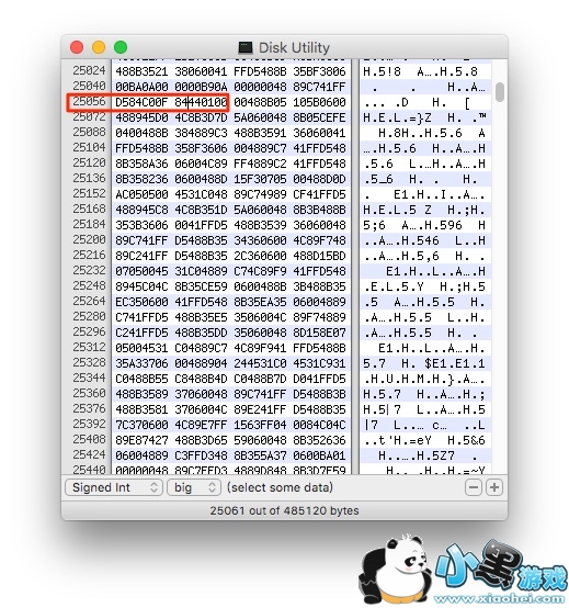 1.下载右边的 Hex 编辑器 Hex Fiend ,然后用其打开桌面上的“Disk Utility”文件。找到第25056行,将 D584C00F 85440100 , 改成 D584C00F84440100 。