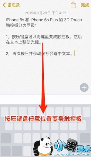 iPhone 6s 和 iPhone 6s Plus 的键盘加入了3D Touch 功能,直接按压键盘即可变身为触控板。iPhone 6s 和 iPhone 6s Plus 的键盘使用 3D Touch 变为触控板分为两级:一是按压键盘可以将键盘变成触控板,然后在文本上移动光标;二是再次按压并移动光标会选中文本。