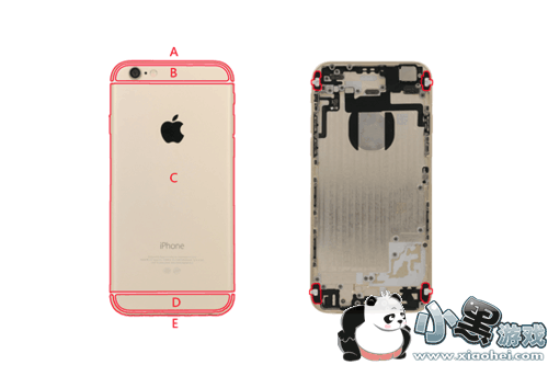 看似一体的的金属后壳,使用塑料填充,其实是被切分成A/BCD/E三段,A、E分别为上部分天线和下半部分天线,中间BCD部分是相互导通的,充当天线接地部分。