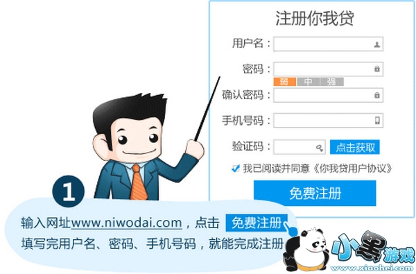 进入到你我贷注册页面,填写基本注册信息及手机号,获取并输入手机验证码,输入验证码,点击我已阅读并同意《你我贷用户协议》,注册成功。