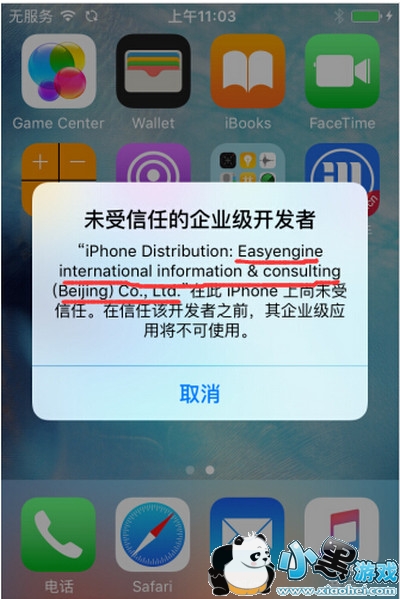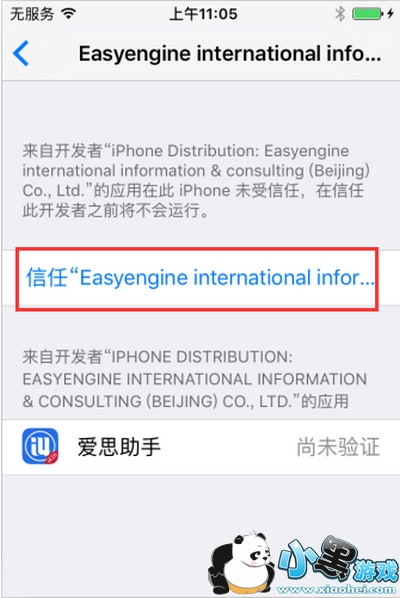 第四步、点击蓝色字体信任,在弹出窗口点击信任。此时再回到桌面即可打开此应用