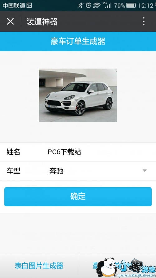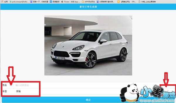 第二步:进入后会如下图,在这里PC6小编选择的是奔驰,这个豪车中里面还包括保时捷卡宴、法拉利兰博基尼,选择在右下角剪头的地方。输入你的姓名,点击确定