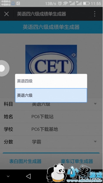 英语四六级成绩单生成器下载地址?微信英语四六级成绩单生成器玩法介绍。英语四六级成绩已经出来了,很多同学们都纷纷晒出自己的成绩单,有些分数高得不可思议,机智的你是不是发现哪里不对呢?他们是用英语四六级成绩单生成器做得成绩单哦!那么英语四六级成绩单生成器下载地址是什么?让PC6小编给大家介绍一下微信英语四六级成绩单生成器玩法吧!