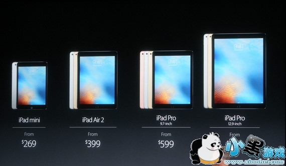 32GB 9.7英寸iPad Pro售价WEI 599MEIYUAN ;128GB售价为749美元;256GB售价为899美元。该产品将于3月24日接受预定,发售时间为3月31日。