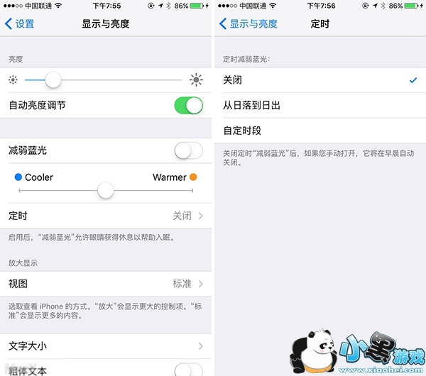 iOS 9.3 新加入的减弱蓝光对于喜欢在睡前玩会手机的朋友来说,非常有用。如果睡前被蓝光影响,我们的睡眠也会受到影响。iOS 9.3 的减弱蓝光可以在设置——显示与亮度中找到,减弱蓝光通过拨动开关开启,并可以选择 cooler 以及 warmer,两个单词旁边还有蓝色和橙色的圆点,提示用户可以根据需要选择减弱蓝光的程度。一般滑动条位于中间位置即可,在下面的选项是定时功能,可以选择关闭定时功能,从日落到日出以及自定义时段。由于白天蓝光对我们的影响不大,推荐大家选择从日落到日出即可。选择之后,iOS 9.3 会根据用户位置信息,在太阳下山时开启减弱蓝光,并在早晨时将屏幕调整成正常状态。