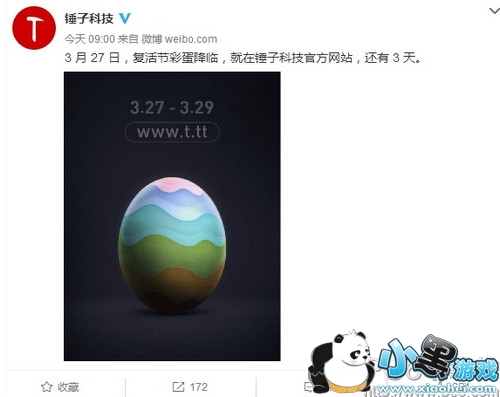 今天,锤子科技在微博上发布了一款神秘的彩蛋新图,并表示在3月27日,复活节彩蛋降临,就在锤子科技官方网站。