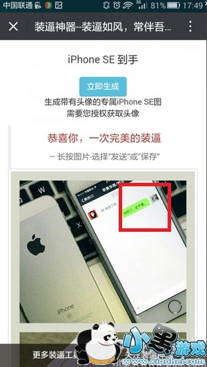 2、关注后找到选项点此装逼,找到iPhone se到手图片生成器