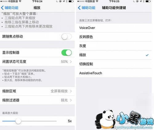 开启‘显示控制器’并在下方选择‘全屏幕缩放’和‘弱光’,之后退回上一级‘辅助功能’页面,滑动到最底部选择‘辅助功能快捷键’,选择‘缩放’选项。
