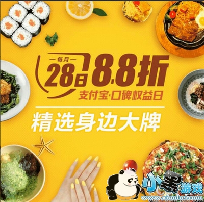 支付宝口碑权益日是支付宝全新推出的一款精选身边大牌美食活动,每月28日都是支付宝口碑权益日,活动当天,同意支付宝实名用户在“口碑-美食类目”有口碑权益日活动标示的商户使用手机支付宝可享8.8折优惠(单笔优惠封顶5元)1此,优惠名额限200万名。8.8折扣优惠(单笔优惠封顶20元)1此,优惠名额限额25万笔。名额有限,先到先得。