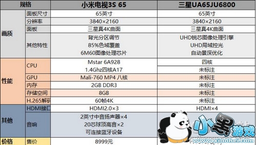 因为乐视的不确定性,当前65英寸曲面电视的对比就不拉上这家小米的“死对头”了。最终我将小米65曲面与三星的HU6800放在了一张表格里,不为别的,两台电视 都采用了三星自家的65英寸曲面4K面板,而且售价算是比较接近了。