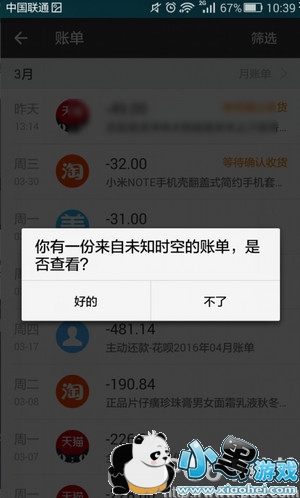 当你看到首先进入支付宝账单时你会收到这么一个推送---你有一份来自未知时空的账单,是否查看,当你按照他的要求看完所有的账单后,满意的退出去,你想会不会下次穿越到不同地方?