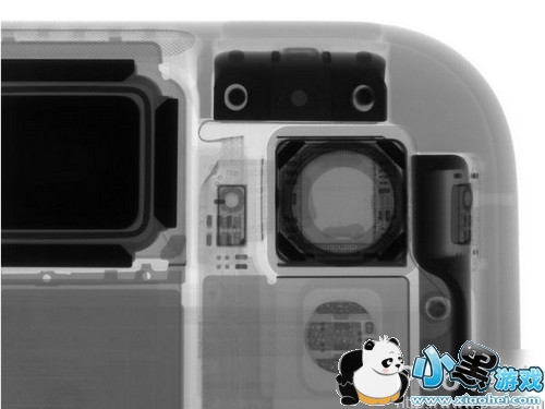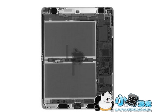 3、我们先看看9.7寸iPad Pro在X光线下的样子。Creative Electron 提供的X射线下的9.7 英寸 iPad Pro。12.9 英寸 iPad Pro 机身中四个扬声器占据了不少空间。但是在 9.7 英寸版本中,电池占据的空间比例才是最大的,逻辑板都被挤到一边了,扬声器更是被放到了角落上。中间印刷电路板上有一道很奇怪的东西是什么?只能通过拆解来看看了。