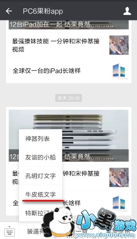 进入公众号页面点击右下角装备神器,点击牛皮纸文字: