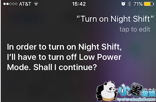 2.长按 Home 键或使用“嘿Siri”调出Siri,然后让 Siri 开启 Night Shift,因为已经开启了低电量模式,所以 Siri 会说:为了打开 Night Shift,我需要关闭低电量模式,要继续吗?