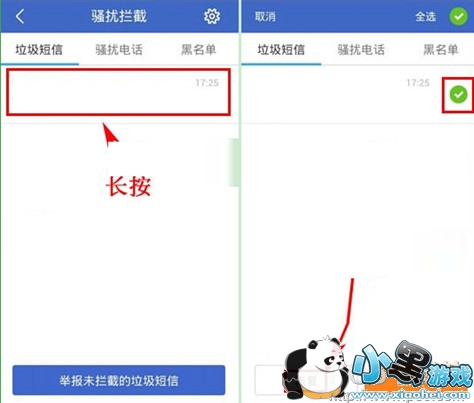 2.长按已拦截的短信,进入选择界面,勾选需要恢复的短信,点击左下角【恢复】即可: