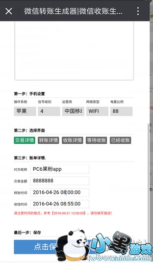 3.进入编辑页面,编辑你的手机型号和转账金额,为了增加真实性还得把时间调好,转账详情都可以编辑: