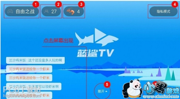 标注:①直播的游戏;②观众人数;③虾米数;④开/关隐私模式;⑤展开或缩略聊天内容: