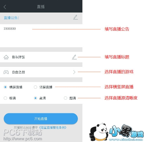 3. 填写直播信息:填写直播公告、填写直播标题、选择直播的游戏、选择横竖屏直播、选择直播源清晰度: